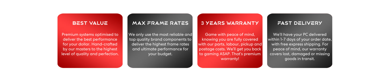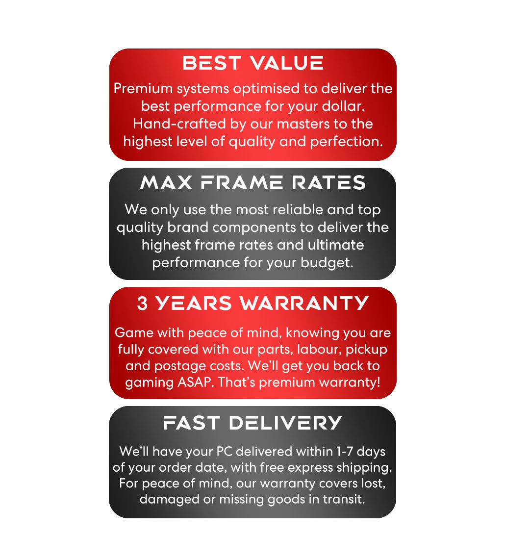 Estimated delivery time is between 2 to 7 business days from the day we receive your order. This estimate takes into account building, handling, dispatch and transit times. Delivery times may vary due to stock availability, different shipping networks and your location. For peace of mind, our warranty policy also covers lost or damaged goods in transit.